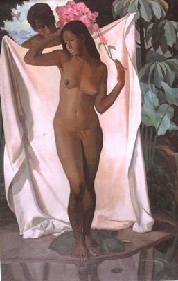 indígena desnuda, una Venus morena, se alza sobre una hoja junto